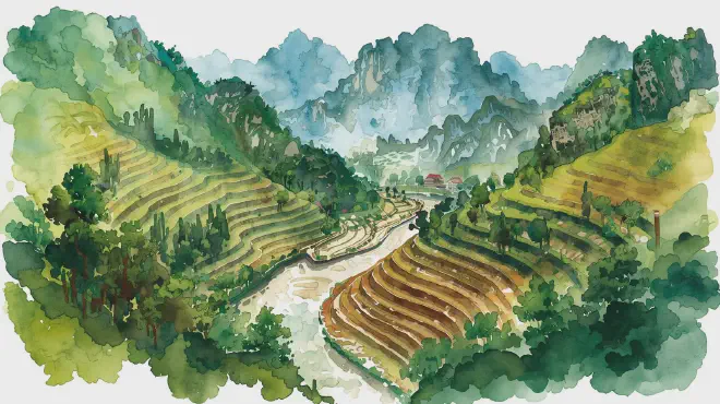 石灰岩の峡谷に響く水音、棚田の緑陰に揺れる竹林、そして山間の村々に漂う炊煙。カオバンは、時の流れが緩やかに感じられる場所である。ここでは自然の雄大さと人々の素朴な暮らしが調和し、訪れる者の心を静かに揺さぶる。