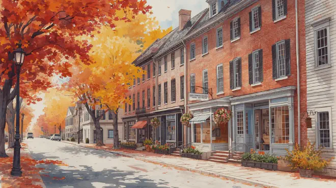午後の散策は、まず街の中心部から始めた。フェデラル・ストリートを歩いていると、1800年代の建物が立ち並ぶ光景に息を呑む。レンガ造りの建物と白いトリムのコントラストが美しく、歩道に落ちた黄色い葉が、まるで自然の絨毯のように足元を彩っている。