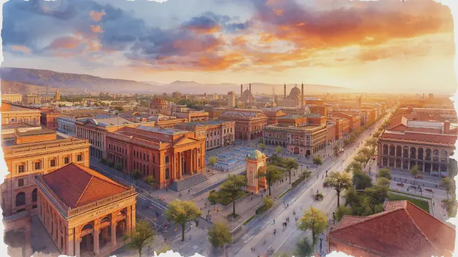 ホテルにチェックインを済ませ、まず向かったのは街の中心部にある共和国広場だった。夕方の斜光が、周囲の建物を美しいバラ色に染めている。この広場を囲む建物は全て、地元産の凝灰岩で造られているため、統一感のある美しい景観を作り出している。国立歴史博物館、国立美術館、政府庁舎が広場を取り囲み、中央には大きな噴水が設けられている。
