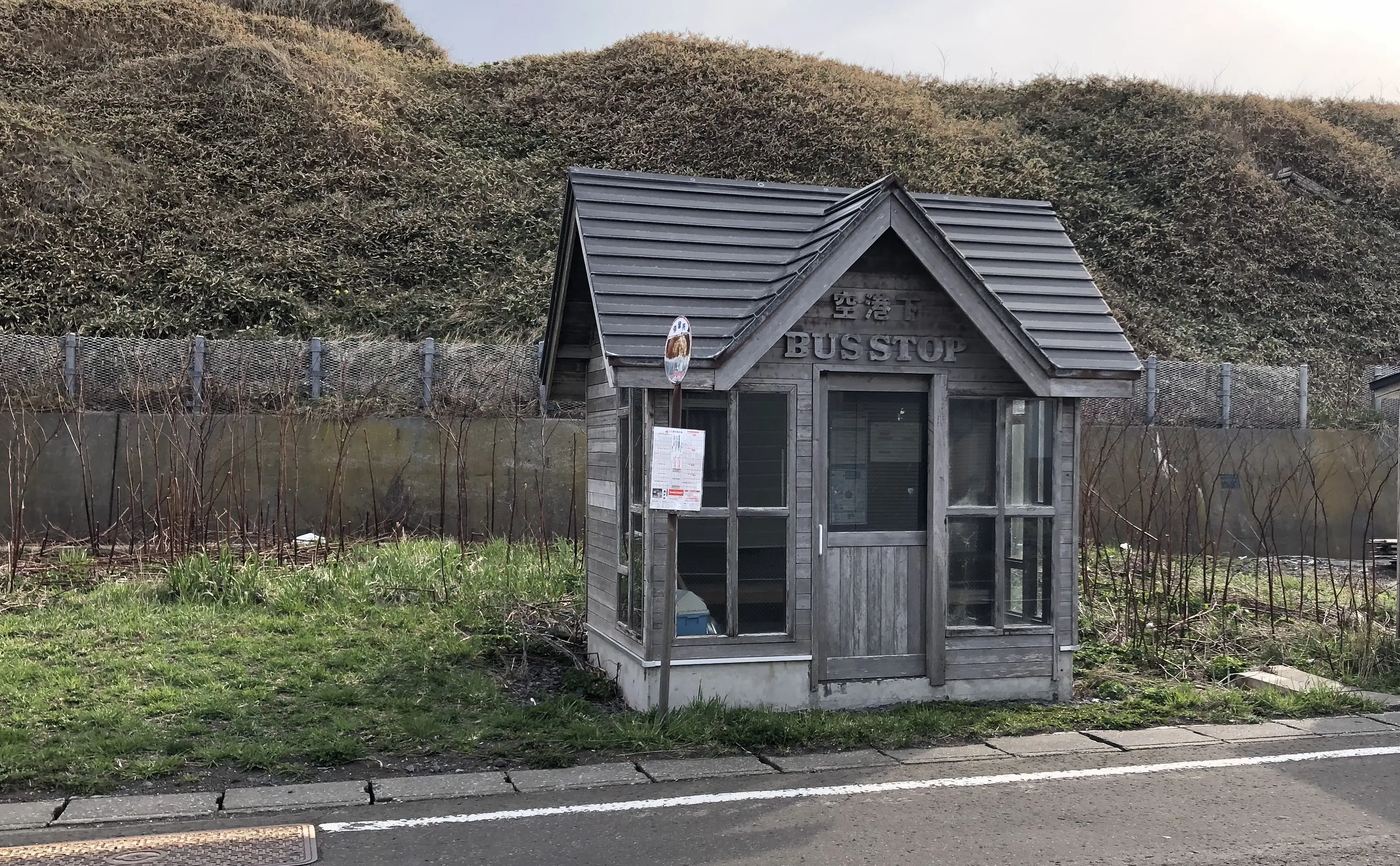 翌朝、始発バスで礼文空港へ向かった。香深フェリーターミナルからバスで約35分、最寄りの「空港下」バス停で下車し、徒歩約10分で到着。